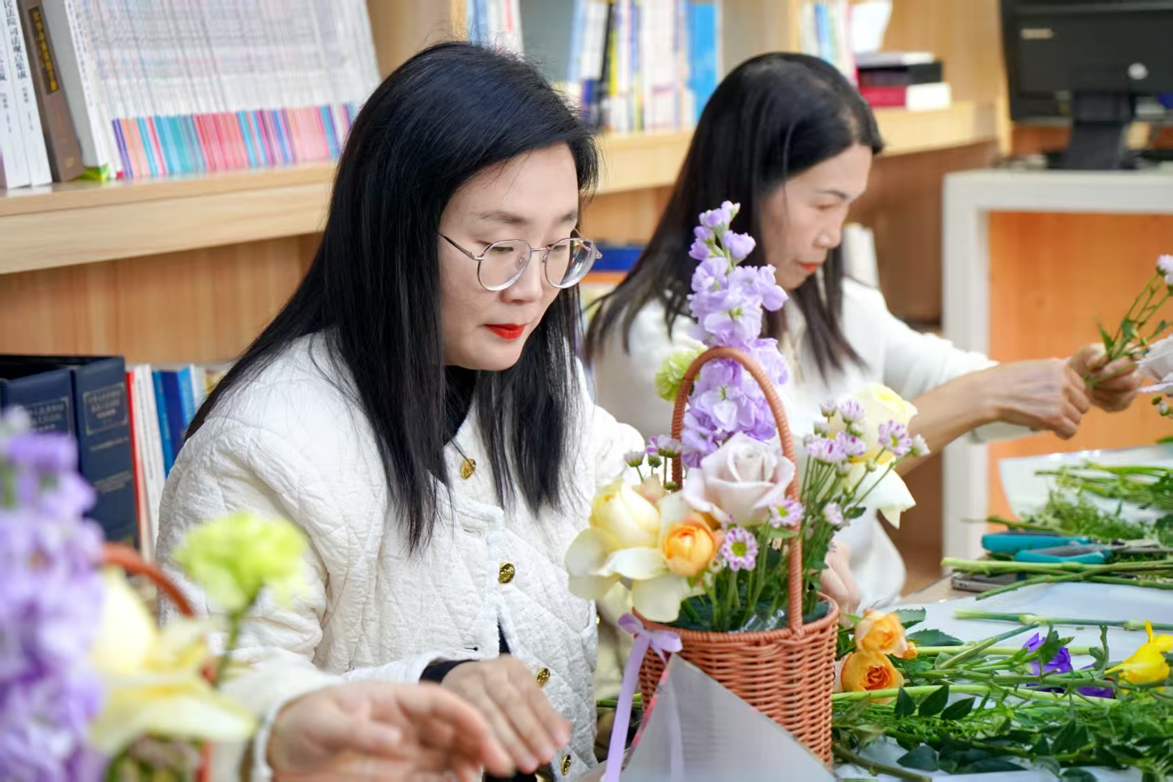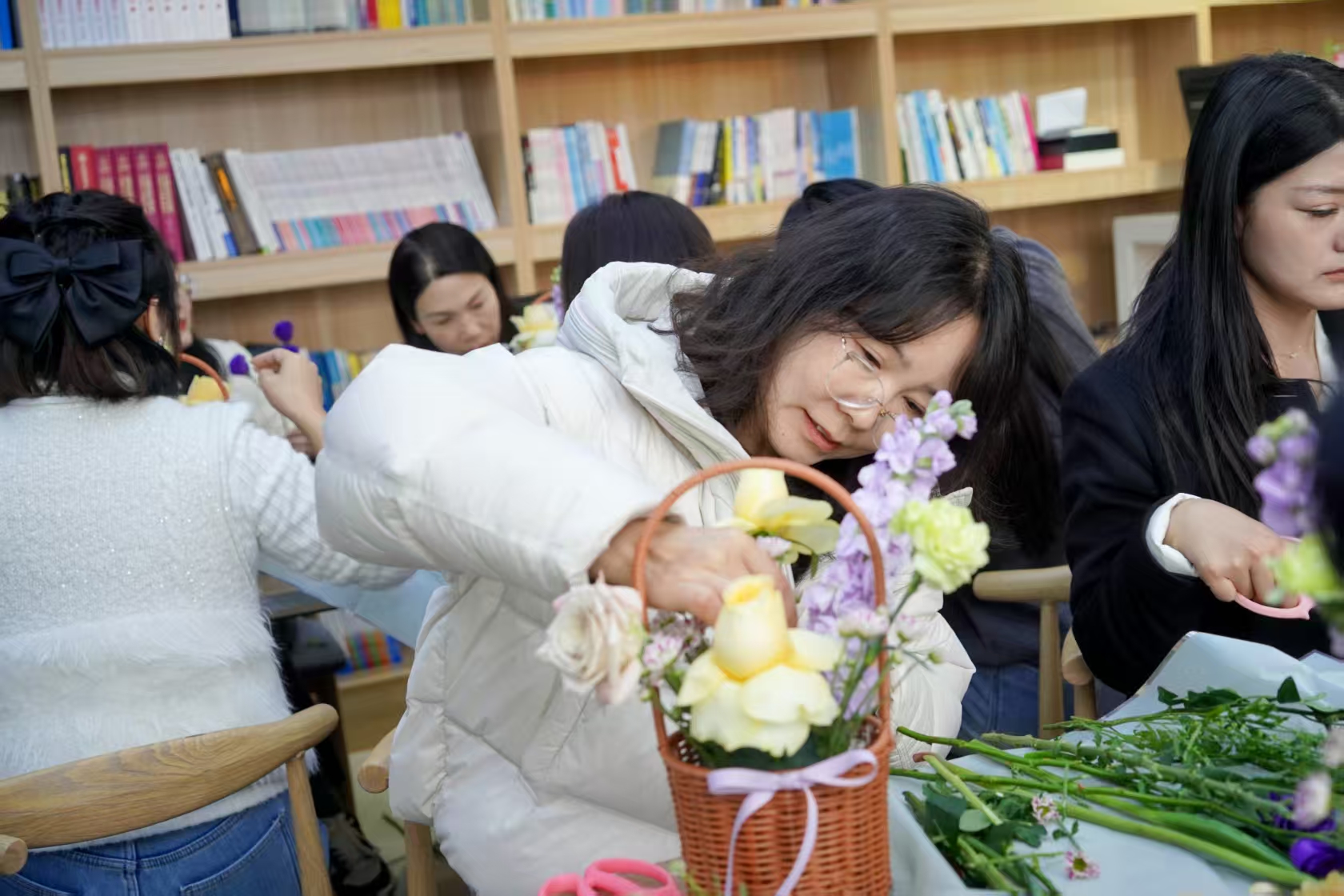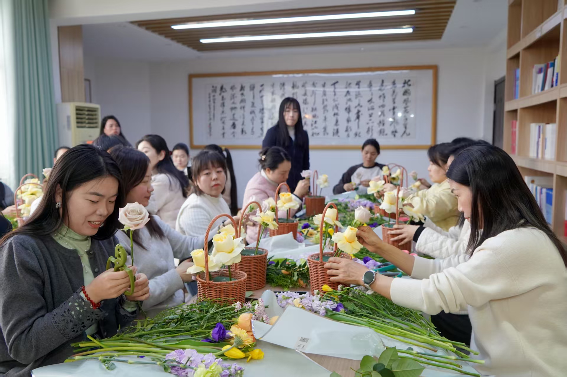 活动以一场雅致的插花疗愈课启幕。花艺老师现场讲解花卉修剪、色彩搭配、造型设计等技巧,从花材选择到构图布局,细致示范、耐心指导。平日里坚守在审判执行、诉讼服务、司法警务、行政保障等岗位的女干警们,暂时放下工作的忙碌,围桌而坐,亲手修剪花枝、搭配色彩、构思造型。指尖轻捻花枝,花香萦绕身旁,一个个错落有致、别具匠心的花艺作品逐渐成型,或清新雅致,或温婉大气,尽显巧思。在与花草的亲密接触中,大家舒缓了身心,释放了压力,感受着生活的美好与诗意。